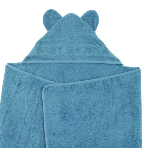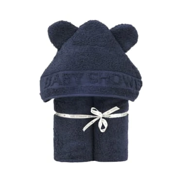 Forme rectangulaire pour bien envelopper bébé et capuche au milieu décorée d’oreilles d’ours et d’un liteau en jacquard brodé “Baby Shower”.